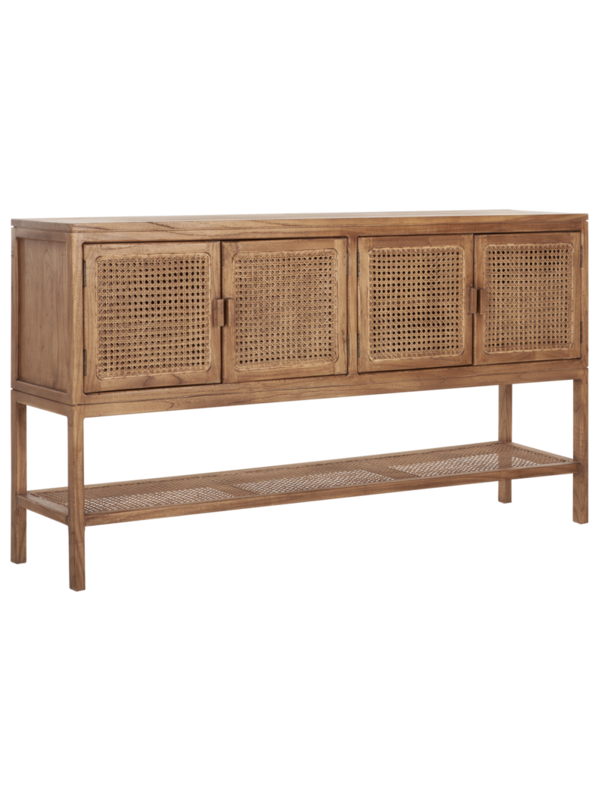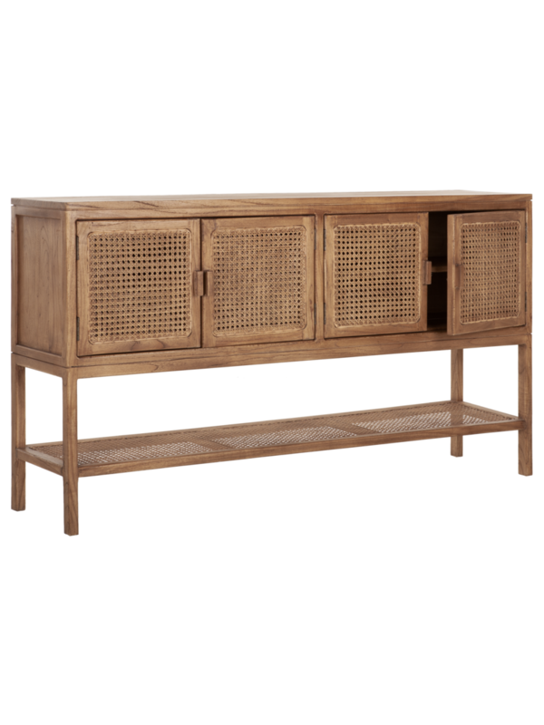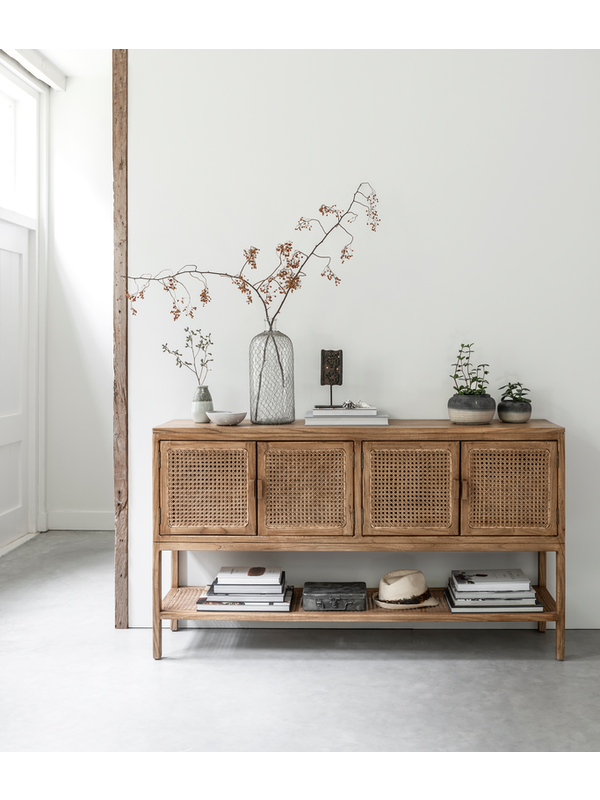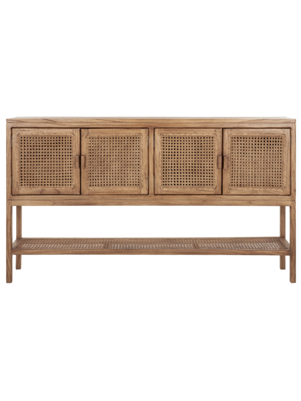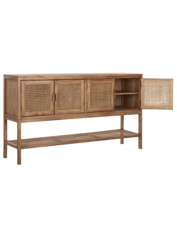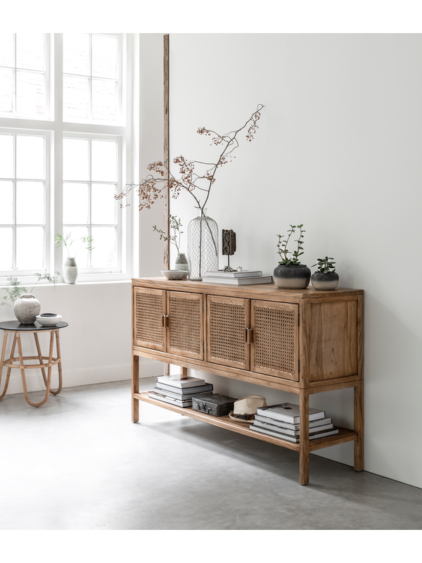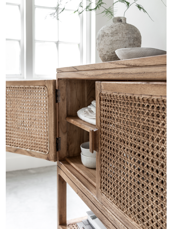 Dressoir Copenhagen is gemaakt van massief mindi hout va A-kwaliteit en is afgewerkt met handgevlochten webbing. Webbing is gemaakt van gevlochten rattan. De deuren zijn voorzien van een dubbele laag webbing, waardoor de kast ook aan de binnenzijde perfect is afgewerkt. Dankzij de magneetsluiting sluiten de deuren mooi strak. Een mooi detail is het zichtbare webbing onderblad. Dressoir Copenhagen is voorzien van 4 deuren en heeft een afmeting van 90x160x40 cm.