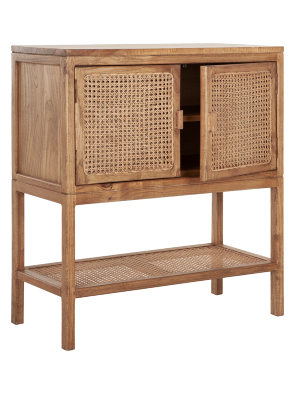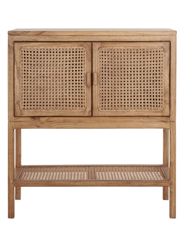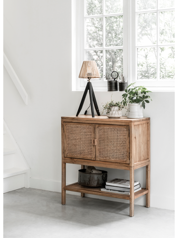 Wandtafel Copenhagen small is gemaakt van A-kwaliteit mindi hout en is afgewerkt met handgevlochten webbing. Webbing is gemaakt van gevlochten rattan. De deuren zijn voorzien van een dubbele laag webbing, waardoor de kast ook aan de binnenzijde perfect is afgewerkt. Dankzij de magneetsluiting sluiten de deuren mooi strak. Een mooi detail is het zichtbare webbing onderblad. Wandtafel Copenhagen heeft een afmeting van 90x80x40 cm.